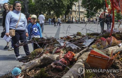 epa09948908 Ukrainians watch an art project 'Screams of Souls' by florist and volunteer Ulyana Datsyshyn, which is on display in Lviv, Ukraine, 15 May 2022. A large map of Ukraine with blood-stained children's toys, destroyed houses, barbed wire, and ears of wheat sprouting through the scorched earth is aimed to symbolize the death Ukrainians and a threat of food shortages. On 24 February, Russian troops invaded Ukrainian territory starting a conflict that has provoked destruction and a humanitarian crisis. According to the UNHCR, more than six million refugees have fled Ukraine and a further 7.7 million people have been displaced internally within Ukraine since. EPA/MYKOLA TYS