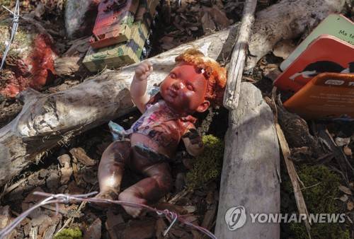 epa09948912 Ukrainians watch an art project 'Screams of Souls' by florist and volunteer Ulyana Datsyshyn, which is on display in Lviv, Ukraine, 15 May 2022. A large map of Ukraine with blood-stained children's toys, destroyed houses, barbed wire, and ears of wheat sprouting through the scorched earth is aimed to symbolize the death Ukrainians and a threat of food shortages. On 24 February, Russian troops invaded Ukrainian territory starting a conflict that has provoked destruction and a humanitarian crisis. According to the UNHCR, more than six million refugees have fled Ukraine and a further 7.7 million people have been displaced internally within Ukraine since. EPA/MYKOLA TYS