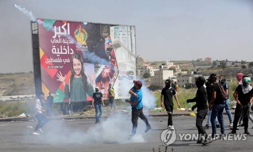 epa09948955 A Palestinian throws back a tear gas grenade at Israeli troops during clashes after a rally marking the 74th anniversary of the Palestinian Nakba, in the West Bank city of Ramallah, 15 May 2022. Nakba Day, or Day of the Catastrophe, which is marked on 15 May to commemorate the expulsion of more than 700,000 Palestinians from their land in the war surrounding the establishment of the state of Israel in 1948. EPA/ALAA BADARNEH