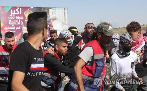 epa09948963 Palestinians evacuate a wounded man during clashes with Israeli troops after a rally marking the 74th anniversary of the Palestinian Nakba, in the West Bank city of Ramallah, 15 May 2022. Nakba Day, or Day of the Catastrophe, which is marked on 15 May to commemorate the expulsion of more than 700,000 Palestinians from their land in the war surrounding the establishment of the state of Israel in 1948. EPA/ALAA BADARNEH