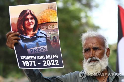 epa09949063 Members of Palestine Foundation (PLF) of Pakistan shout slogans and carry placards during a protest against Israel in solidarity with Palestinians after the journalist Shireen Abu Akleh was shot dead by Israeli forces in Karachi, Pakistan, 15 May 2022. According to the Palestinian Ministry of Health, Al Jazeera journalist Shireen Abu Akleh was shot dead by Israeli forces on 11 May morning during an Israeli raid in the West Bank city of Jenin. EPA/SHAHZAIB AKBER
