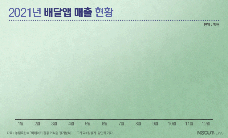 농림축산식품부의 '빅데이터 활용 외식업 경기분석'에 따르면 지난해 12월 배달앱 매출은 1조 6328억으로 전월대비 2904억원 늘면서, 외식업 전체 매출액의 16.6%를 차지한 것으로 나타났습니다. 사회적 거리두기 강화 조치로 오프라인 외식 이용이 감소하면서 배달 이용이 증가한 것으로 보입니다.