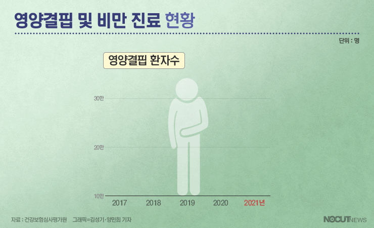 2021년 영양결핍 환자수는 33만 5441명으로 2017년의 14만 9791명에 비해 123.9%(연평균 22.3%) 증가했습니다. 비만 환자수도 3만 170명으로 2017년에 비해 101.6%(연평균 19.2%) 증가한 것으로 나타났습니다.