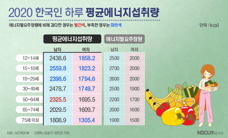 보건복지부가 발표한 '2020 한국인 영양소 섭취기준'을 보면 19~29세 여성의 경우 하루에 필요한 에너지는 2000㎉이지만, 평균 섭취량은 이에 미치지 못하는 1794㎉로 나타났습니다. 또 75세 이상의 여성도 필요량인 1500㎉보다 적은 1305.4㎉를 섭취하고 있는 것으로 조사됐습니다.