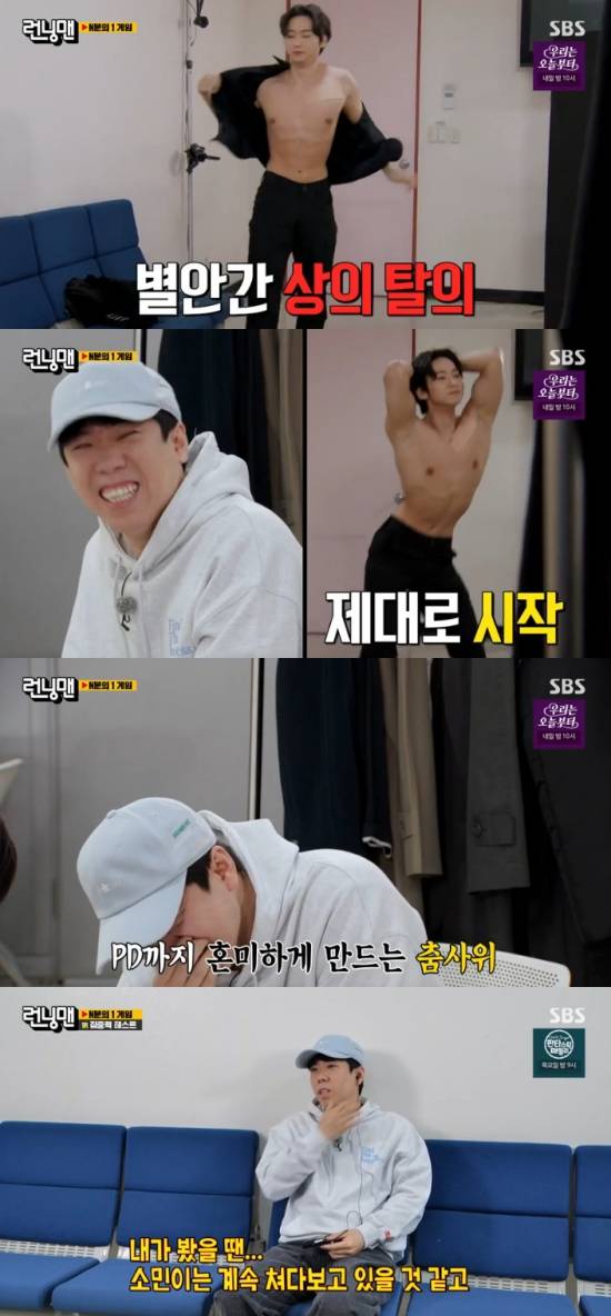 이때 양세찬은 전소민의 반응을 예측했고, "소민이는 웃통 벗고 있을 때 계속 쳐다보고 있을 거 같다"라며 확신했다.