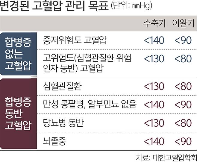 기존에 심혈관질환, 단백뇨가 동반된 만성 콩팥병 및 열공성뇌경색이 합병된 고혈압의 경우에만 적용되던 기준이 확대된 것이다. 합병증이 없는 단순 고혈압의 경우 기존과 동일하게 목표 혈압은 140/90㎜Hg로 유지된다.