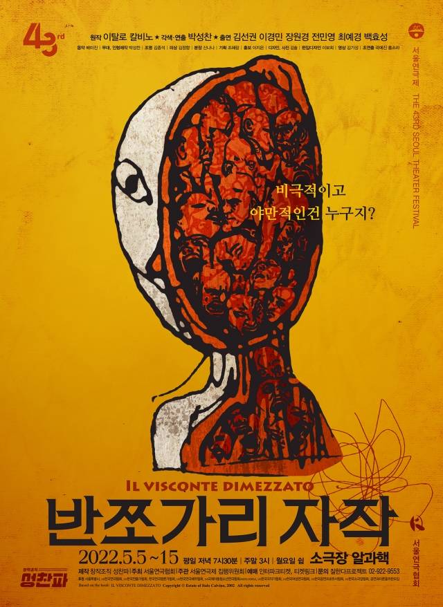역사적으로 세계 정치지형을 둘러싼 영토 전쟁과 극단적인 이념 전쟁, 수 세기 동안 일어난 전쟁은 박제(剝製)된 세계사나 한국사의 한 장면이 아니라 지금 이 시각에도 세계는 핵으로 무장하고 첨단무기를 만지작거리며 러시와의 침공(侵攻)으로 우크라이나 영토는 죽음의 핏물자국의 도시가 되어가고 있다. 잘한다 프로젝트(대표 조혜랑)가 기획한 <반쪼가리 자작>(창작조직 성찬파, 연출 박성찬, 5.5~15 소극장 알과핵) 은 17세기 오스만의 투르크인들과 이탈리아의 종교전쟁에 참전해 몸은 포탄의 파편으로 몸은 선과 악으로 반쪼가리가 되어 고향 테랄바(이탈리아)로 돌아와 영토를 지배하는 동화 같은 메다르도 자작의 이야기다.