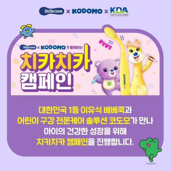 라이온코리아의 어린이 구강 전문 브랜드 코도모는 영유아 식품 전문 기업 베베쿡과 함께 1년간 '치카치카 캠페인'을 벌인다고 16일 밝혔다.