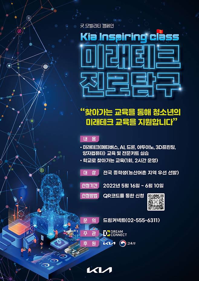 -기아 인스파이어링 클래스 - 미래테크 진로탐구 -메타버스·AI·드론 등 기본지식 교육 및 실습 -전국 중학교 대상 모집, 5월16~6월10일까지 신청 기아가 청소년 진로교육 사회공헌 프로그램인 기아 인스파이어링 클래스 – 미래테크 진로탐구의 참가자를 모집한다고 16일 밝혔다.