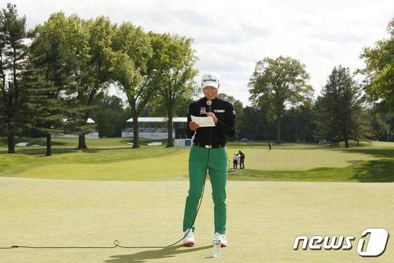 (클리프턴 AFP=뉴스1) 우동명 기자 = 호주 교포 이민지가 15일(현지시간) 뉴저지주 클리프턴의 어퍼 몽클레어 컨트리클럽에서 열린 LPGA 투어 코그니전트 파운더스컵 대회서 통산 7번째 우승을 한 뒤 소감을 말하고 있다.