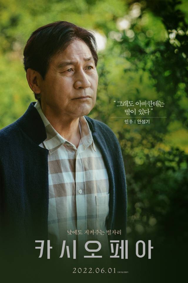 안성기의 캐릭터 포스터는 눈물을 머금고 있는 애틋한 표정이 단번에 보는 이의 마음까지 뭉클하게 만들어 대배우의 위엄을 힘있게 보여준다. "그래도 아빠한테는 딸이 있다"라는 카피는 극중 부녀 호흡을 맞춘 서현진과의 애틋하고 아주 특별한 동행에 대한 기대감을 높인다. 그동안 수많은 작품을 통해 다양한 캐릭터를 연기한 국민 배우 안성기는 '카시오페아'를 통해 지금껏 본 적 없던 부성애 열연을 펼쳐 관객들의 마음을 울릴 예정이다.