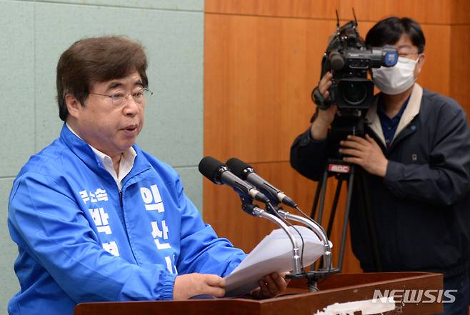 [전주=뉴시스] 김얼 기자 = 무소속 박경철 익산시장 후보가 16일 전북 전주시 전북도의회 기자회견장에서 익산시장 출마 기자회견을 열고 질의에 답변하고 있다. 2022.05.16. pmkeul@newsis.com