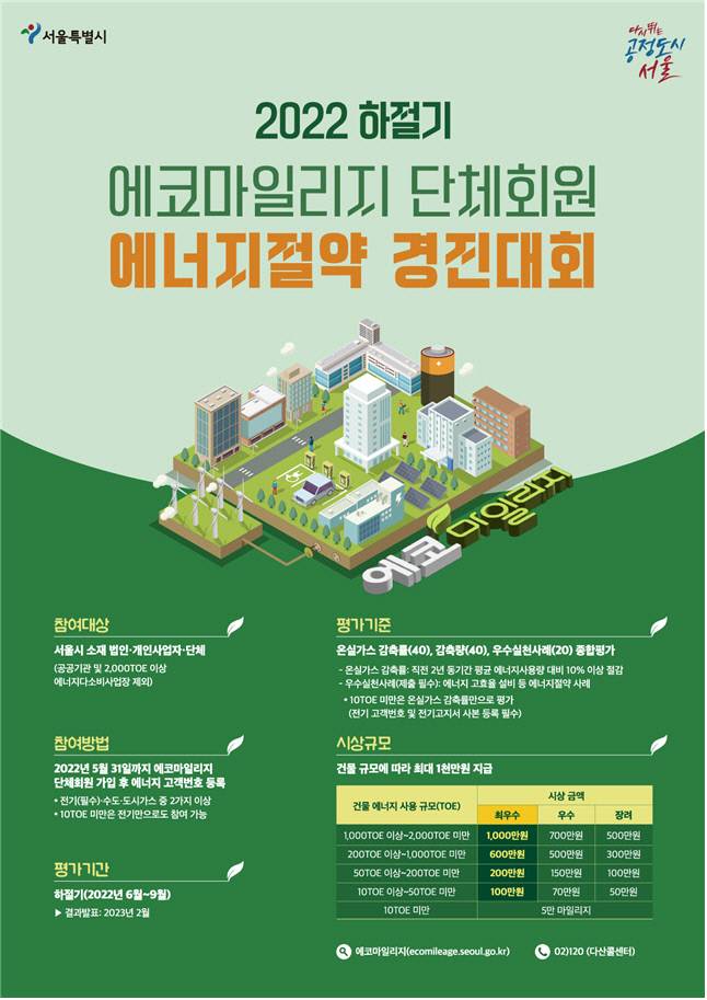 에코마일리지 단체회원 에너지절약 경진대회는 에코마일리지에 가입한 서울 소재 법인·개인사업자·단체를 대상으로 에너지 사용 규모에 따라 최대 1000만원 상금을 지급하는 사업이다. 에너지 사용이 많은 6~9월 에너지 소비를 줄이고, 온실가스 감축을 장려하기 위한 취지다.