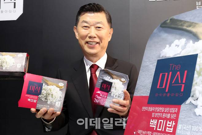 [이데일리 방인권 기자] 김홍국 하림 회장이 16일 서울 강남구 SJ쿤스트할레에서 즉석밥 'The미식 밥'을 선보이고 있다.