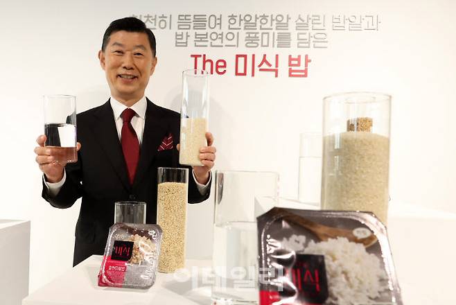 [이데일리 방인권 기자] 김홍국 하림 회장이 16일 서울 강남구 SJ쿤스트할레에서 즉석밥 'The미식 밥'을 선보이고 있다.