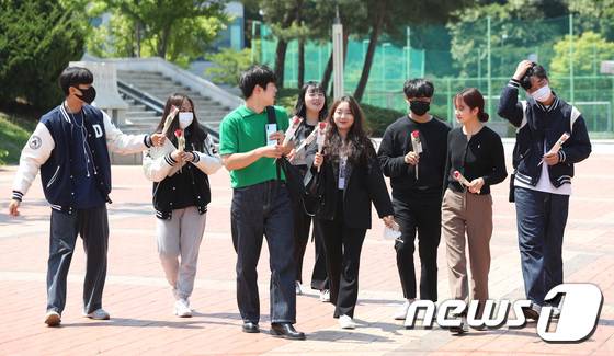 (용인=뉴스1) 김영운 기자 = 16일 오전 경기 용인 수지구 단국대학교 죽전캠퍼스에서 성년의 날을 맞아 장미꽃을 받은 학생들이 꽃을 들고 캠퍼스를 걷고 있다. 2022.5.16/뉴스1