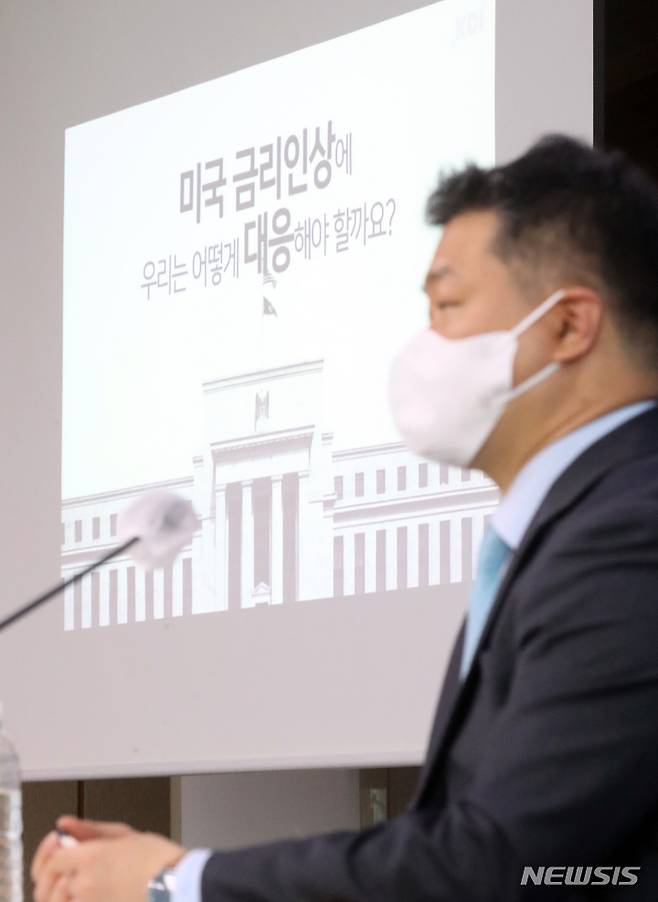 [세종=뉴시스] 강종민 기자 = 정규철 KDI 경제전망실장이 16일 오전 세종시 정부세종청사에서 '미국의 금리인상과 한국의 정책대응'에 대해 발표하고 있다. 2022.05.16. ppkjm@newsis.com