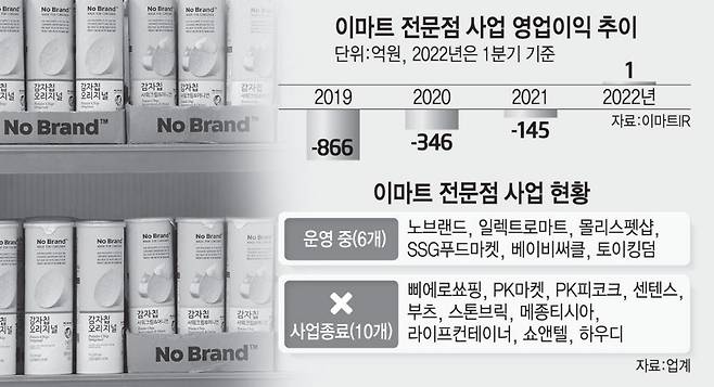 그 결과 16개에 이르던 이마트 전문점 중 10개 브랜드가 사업을 종료했다. 하우디는 오프라인 매장 종료에 이어 이달 내 온라인 사업도 철수한다. 남은 전문점은 노브랜드와 일렉트로마트, 몰리스펫샵, SSG푸드마켓, 베이비써클, 토이킹덤 등 6개다. 이들 전문점도 수익성이 떨어지는 로드숍 매장은 정리하고 숍인숍 중심으로 효율화를 꾀했다.
