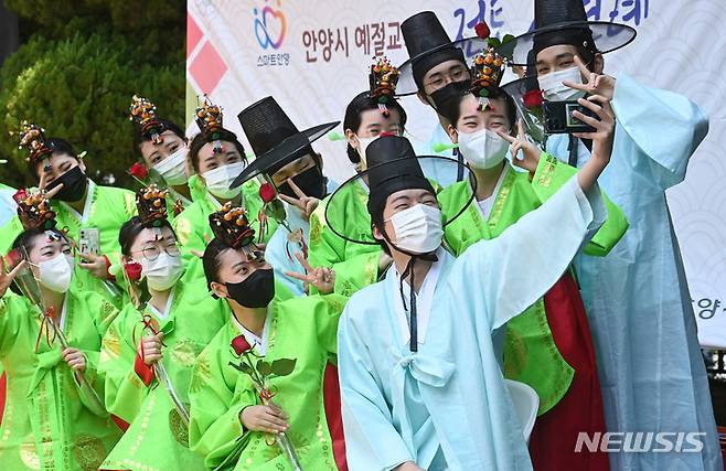 [안양=뉴시스] 김종택기자 = 성년의 날인 16일 오전 경기도 안양예절교육관에서 열린 전통성년례 행사에서 올해로 만19세가 되는 청소년들이 기념촬영을 하고 있다. 2022.05.16. jtk@newsis.com