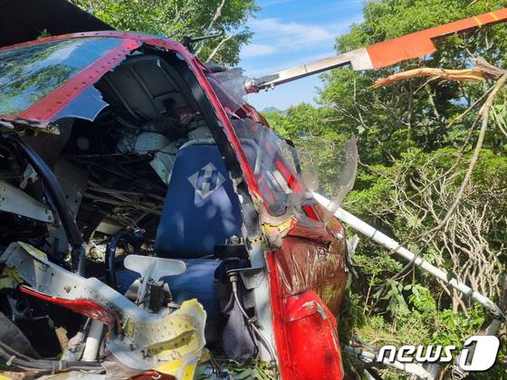 (거제=뉴스1) 김영훈 기자 = 16일 경남 거제시 선자산 부근에 숲길 조성을 하던 시코르스키 헬기 추락하여 헬기 동체가 파손되어 있다. (경남 경찰 제공) 2022.5.16/뉴스1