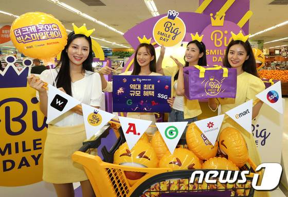 (서울=뉴스1) 구윤성 기자 = 16일 오전 서울 성동구 이마트 성수점에서 모델들이 G마켓·옥션의 할인 행사인 '빅스마일데이'를 알리고 있다.