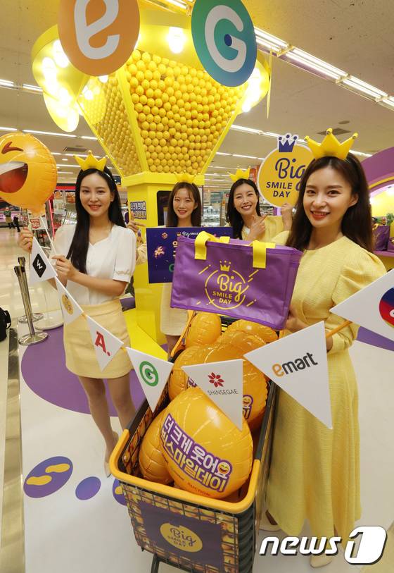 (서울=뉴스1) 구윤성 기자 = 16일 오전 서울 성동구 이마트 성수점에서 모델들이 G마켓·옥션의 할인 행사인 '빅스마일데이'를 알리고 있다.
