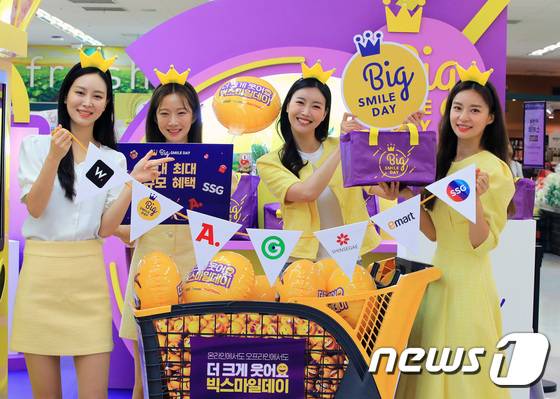 (서울=뉴스1) 구윤성 기자 = 16일 오전 서울 성동구 이마트 성수점에서 모델들이 G마켓·옥션의 할인 행사인 '빅스마일데이'를 알리고 있다.