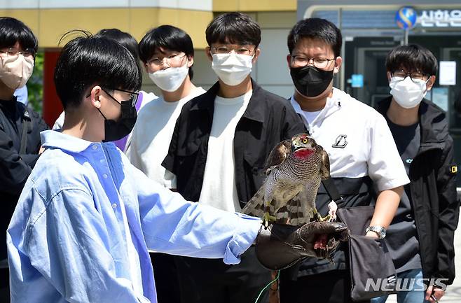 [대구=뉴시스] 이무열 기자 = 16일 오전 대구 북구 경북대학교에서 열린 ‘2022 봄 경북대 문화주간 행사’를 찾은 학생들이 천연기념물 참매를 손에 얹고 매사냥 체험을 하고 있다. 2022.05.16. lmy@newsis.com