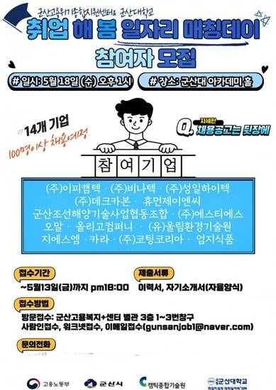 참여기업과 채용정보 등 자세한 사항은 군산고용위기종합지원센터(063-450-1317)로 문의하거나 홈페이지(http://www.gunsanjh.or.kr)를 참고하면 된다.