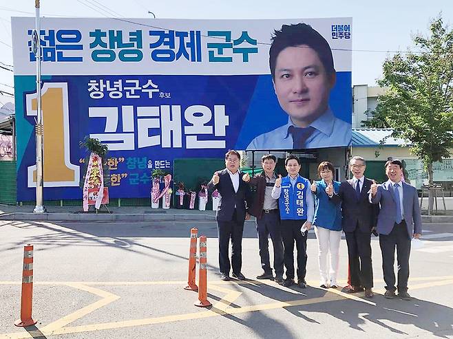 [창녕=뉴시스] 안지율 기자 = 6·1 지방선거 경남 창녕군수에 도전하는 더불어민주당 김태완 후보가 창녕군 창녕읍 남산회전교차로에서 선거사무소 개소식을 갖고 본격적인 선거운동에 돌입했다. 김 후보는 경남의 16개 지역위원장 중 최연소다.