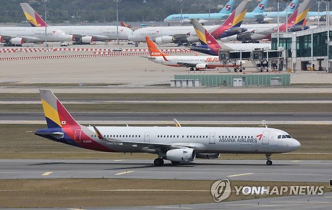 (영종도=연합뉴스) 임헌정 기자 = 아시아나항공 및 저비용항공사(LCC)의 올해 1분기 실적 발표가 예정된 16일 영종도 인천국제공항에 아시아나항공과 LCC 항공사 여객기들이 보이고 있다. 2022.5.16