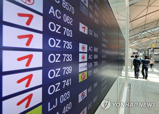 (영종도=연합뉴스) 임헌정 기자 = 아시아나항공 및 저비용항공사(LCC)의 올해 1분기 실적 발표가 예정된 16일 영종도 인천국제공항 제1여객터미널의 출발 항공편 안내 모니터에 표시된 아시아나항공 로고. 2022.5.16