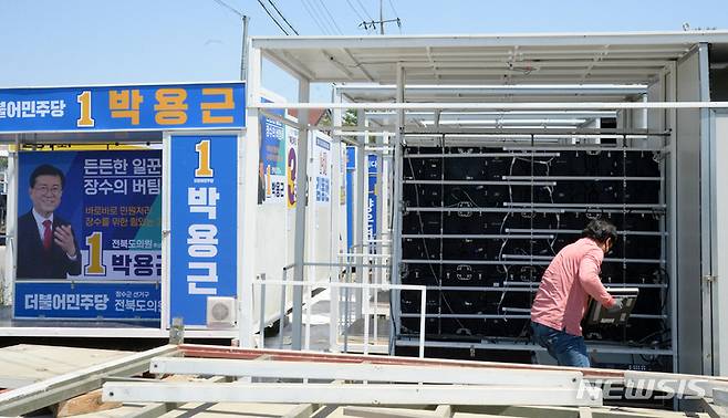 [전주=뉴시스] 김얼 기자 = 제8회 전국동시지방선거를 앞둔 16일 전북 전주시의 한 차량광고업체에서 관계자들이 후보들의 유세차를 제작하고 있다. 2022.05.16. pmkeul@newsis.com
