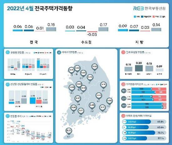 지방 5대 광역시는 0.04% 하락해 전달(-0.06%)보다 하락폭이 축소됐다. 다른 지방은 0.09%로 올라 전월(0.07%)보다 상승폭이 확대되면서 전국의 주택가격도 3월 0.02%에서 4월에는 0.06%로 오름폭이 커졌다.
