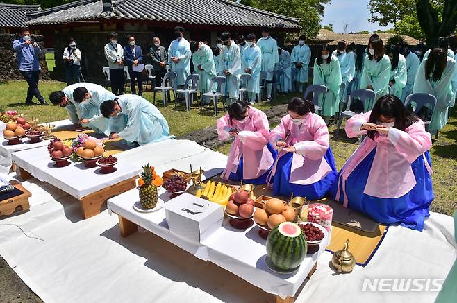 [서귀포=뉴시스] 우장호 기자 = 16일 오전 제주 서귀포시 표선면 정의향교 명륜당에서 '제50회 성년의 날' 기념 전통성년례 재현행사가 열리고 있다. 서귀포시가 주최하고 정의향교가 주관한 이 행사에서는 전통의복인 평상복, 외출복, 예복을 번갈아 입으며 남자인 경우 갓을 씌워주는 관례와 여자인 경우 쪽을 올려 비녀를 꽂는 계례 예식이 재현됐다. 2022.05.16. woo1223@newsis.com