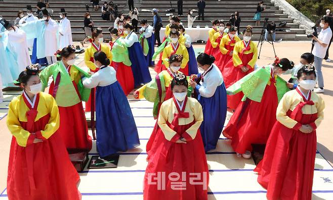 [이데일리 이영훈 기자] 전통 성년례 재현 행사가 16일 오전 서울 남산골 한옥마을 천우각 광장에서 열린 가운데 참석자들이 한복을 입고 행사에 참여하고 있다.