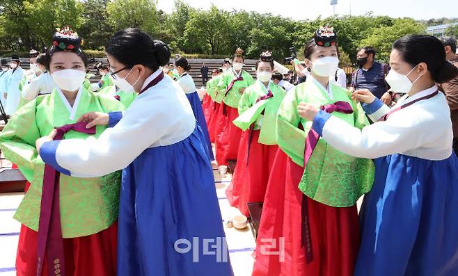 [이데일리 이영훈 기자] 전통 성년례 재현 행사가 16일 오전 서울 남산골 한옥마을 천우각 광장에서 열린 가운데 참석자들이 한복을 입고 행사에 참여하고 있다.