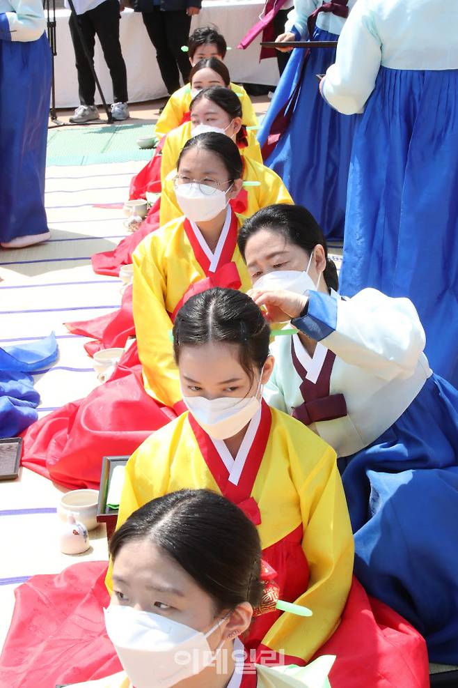 [이데일리 이영훈 기자] 전통 성년례 재현 행사가 16일 오전 서울 남산골 한옥마을 천우각 광장에서 열린 가운데 참석자들이 한복을 입고 행사에 참여하고 있다.