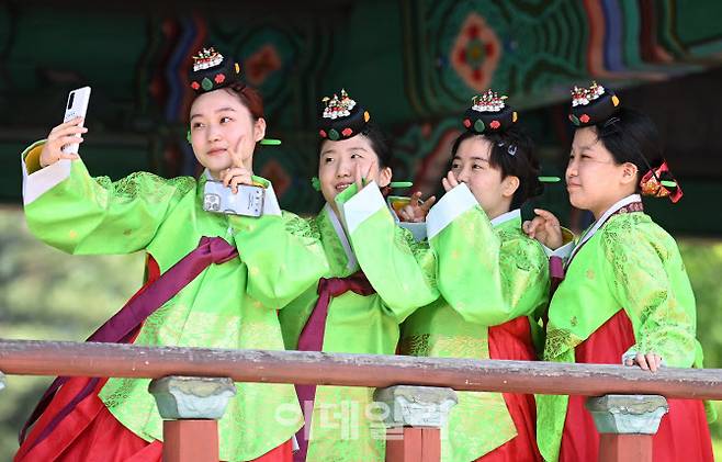 [이데일리 이영훈 기자] 전통 성년례 재현 행사가 16일 오전 서울 남산골 한옥마을 천우각 광장에서 열린 가운데 참석자들이 한복을 입고 사진을 찍고 있다.
