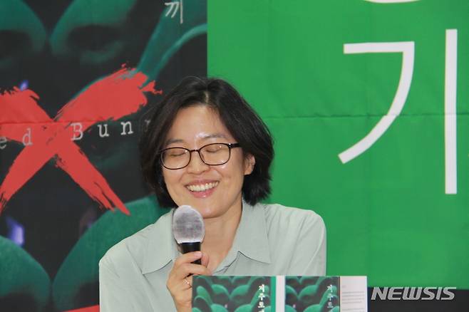 [포항=뉴시스] 이바름 기자 = 16일 오후 2시 경북 포항시청에서 부커상 인터내셔널 부문 최종 후보에 오른 정보라 작가가 기자회견을 갖고 기자들의 질문에 답변하고 있다. 2022.05.16. right@newsis.com
