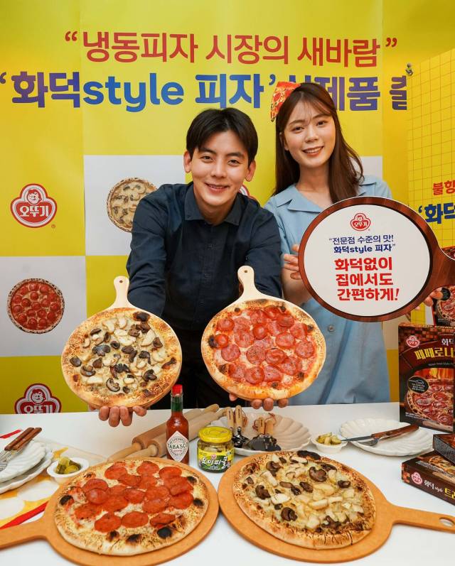 16일 서울 성동구 마리오네에서 열린 오뚜기 ‘화덕style 피자’ 출시 기념행사에서 모델들이 신제품과 함께 포즈를 취하고 있다. 이번에 새롭게 선보인 ‘화덕style 피자’는 페페로니디아볼라 피자와 트러플풍기 피자 등 2종으로 직화 오븐에 구워 도우의 쫄깃한 식감과 화덕 특유의 불향과 깊은 풍미를 즐길 수 있다./사진제공=오뚜기