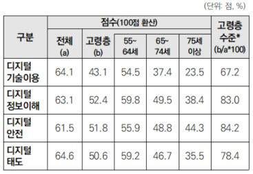 55세 이상 고령층의 디지털 역량 수준은 △디지털 안전 52.8점 △디지털 정보이해 52.4점 △디지털 태도 50.6점, △디지털 기술이용 43.1점 순이었다.