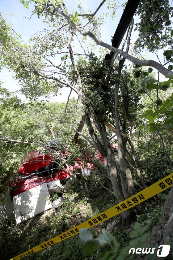 (거제=뉴스1) 김영훈 기자 = 16일 경남 거제시 선자산 부근에 숲길 조성을 하던 시코르스키 헬기 추락해 동체가 파손되어 있다. 2022.5.16/뉴스1