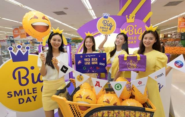 16일 서울 성동구 이마트 성수점에서 모델들이 G마켓·옥션의 할인 행사인 '빅스마일데이'를 알리고 있다. 이번 행사는 G마켓과 옥션이 신세계그룹 편입 이후 진행되는 첫 번째 빅 프로모션으로 이마트, 이마트24, SSG닷컴, W컨셉 등 신세계 온·오프라인 멀티 채널을 통해 파격적인 쇼핑 혜택을 제공한다.