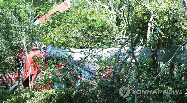 (거제=연합뉴스) 한지은 기자 = 16일 오전 8시 40분께 경남 거제시 거제면 선자산 정상 부근에서 헬기가 추락했다. 이 사고로 60대 기장 1명이 숨지고 부기장과 정비사 등 2명이 중상을 입었다. 2022.5.16