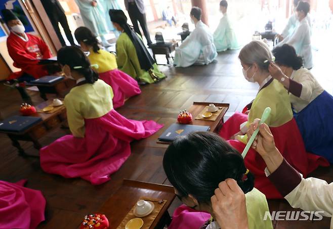 [부산=뉴시스] 하경민 기자 = 제50회 성년의 날인 16일 오전 부산 동래구 동래향교에서 올해 성년이 된 남녀 14명이 전통성년례를 올리고 있다. 2022.05.16. yulnetphoto@newsis.com