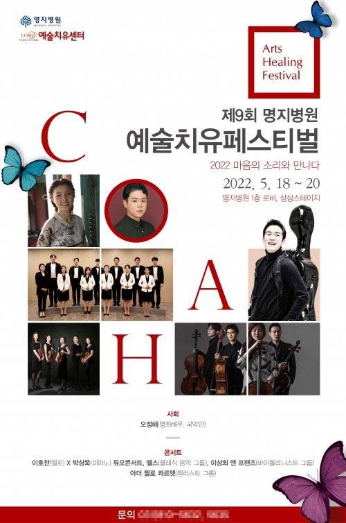 올해로 9회째인 행사로 명지병원 예술치유센터가 주관해 전문 음악인들이 출연하는 힐링콘서트, 입원 환우들을 찾아가는 베드사이드콘서트, 영상으로 만나는 예술치유 전시회, 환우들의 미술 심리치료 전시회 등을 실시한다.
