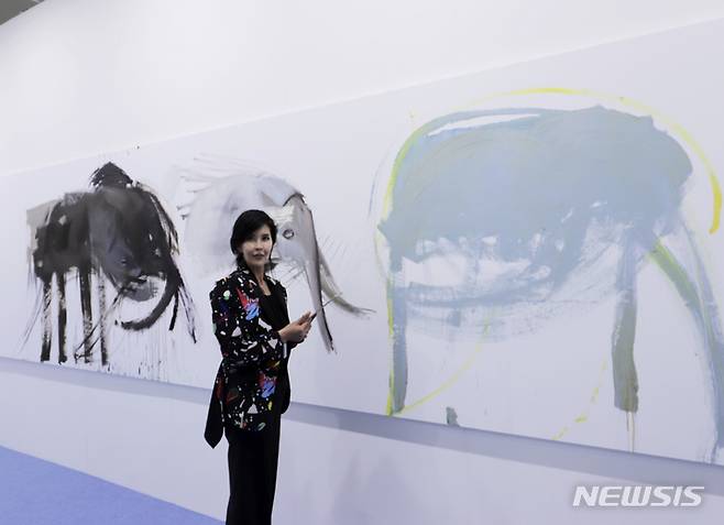 [부산=뉴시스]박현주 미술전문기자=2022 아트부산에 참가한 서울 강남구 신사동 이길이구갤러리 백운아 대표가 가로 5m 크기의 유현경의 신작 '패밀리1' 작품을 소개하고 있다. 이길이구갤러리는 이번 아트부산에 전속작가인 유현경을 비롯해 권하나, 나난, 마이큐, 성태진, 이슬아, 임영균, 전재은, 허유진, 홍지희 작품을 전시 판매했다. 2022.5.12. photo@newsis.com