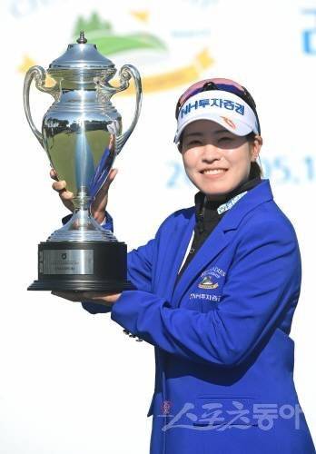 15일 경기도 용인시 수원컨트리클럽에서 열린 KLPGA투어 ‘2022 NH투자증권 레이디스 챔피언십’에서 박민지가 11언더파로 우승을 확정지은 뒤 포즈를 취하고 있다.