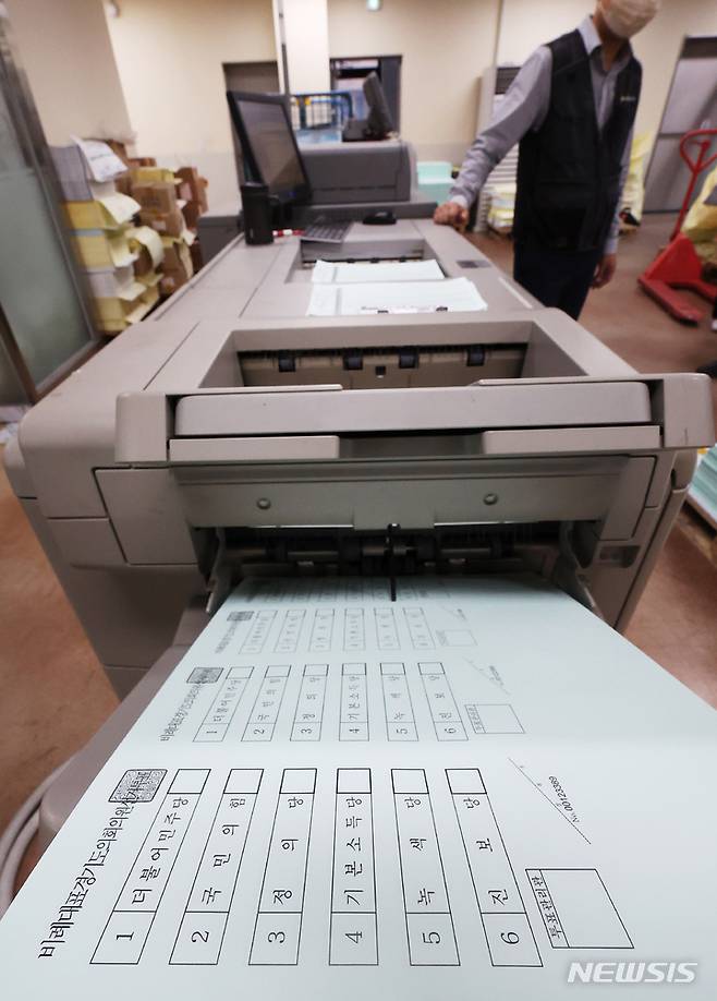 [수원=뉴시스] 김종택기자 = 16일 오후 경기도 수원시의 한 출력인쇄업체에서 제8회 전국동시지방선거 비례대표 경기도의회의원 투표용지가 인쇄되고 있다. 2022.05.16. jtk@newsis.com